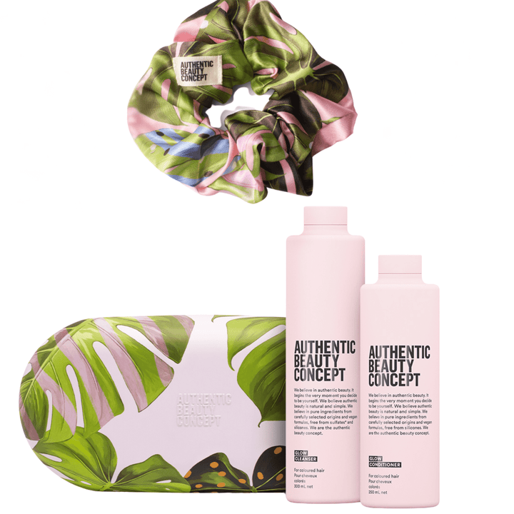 Glow Christmas Gift Set de Authentic Beauty Concept x WOUF – Diseñado exclusivamente en Barcelona y presentado en una caja metálica premium, incluye Glow Cleanser (300 ml) y Glow Conditioner (250 ml) para cabello teñido, junto con un scrunchie de edición limitada, confeccionado en 100% PET reciclado y con un estampado a juego.